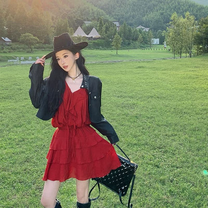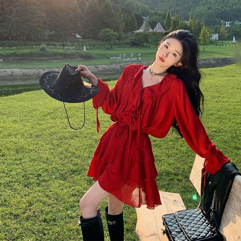 Skirt + Plain Set: Blouse V-Neck Mini Tiered A-Line Long-Sleeve