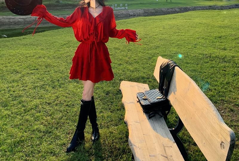 Set: Long-Sleeve V-Neck Plain Blouse + Tiered Mini A-Line Skirt