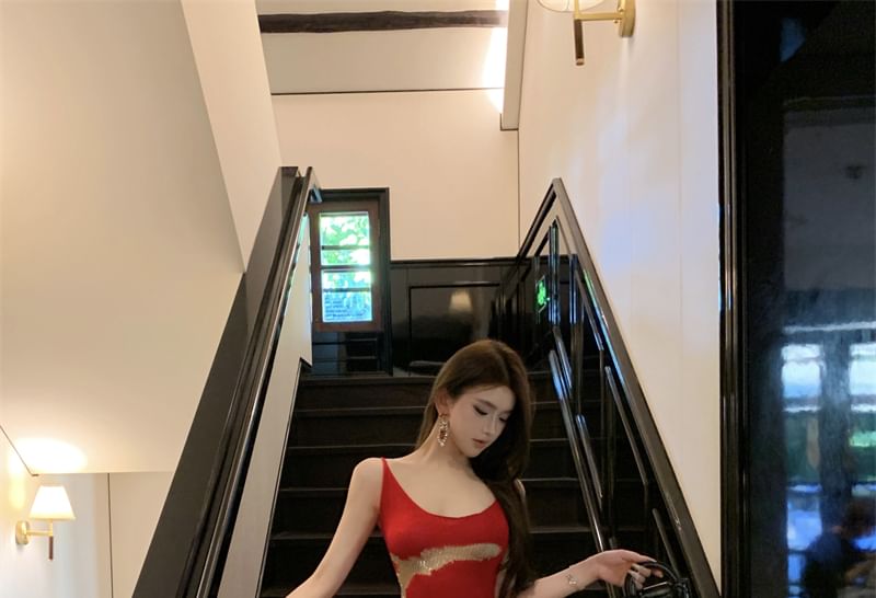 Sleeveless Bodycon Back Patterned Open Dress Scoop Neck Maxi