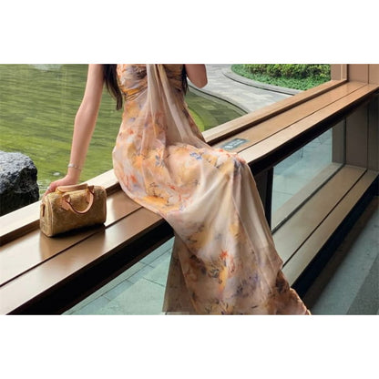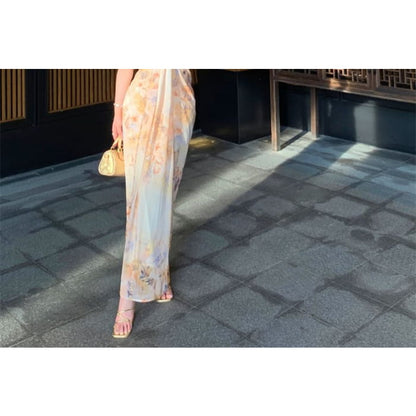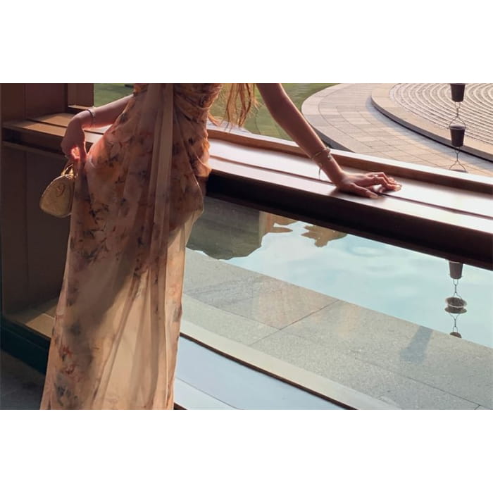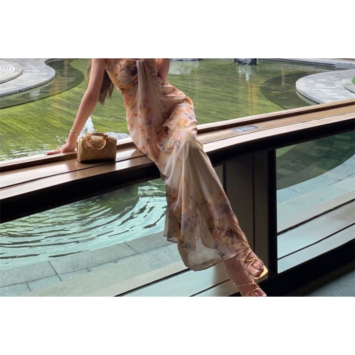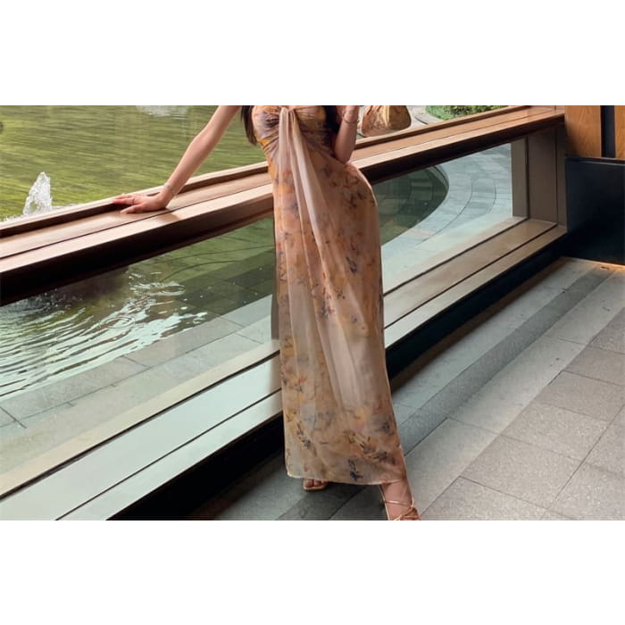 Spaghetti Strap Floral Print Ruched Bodycon Maxi Dress
