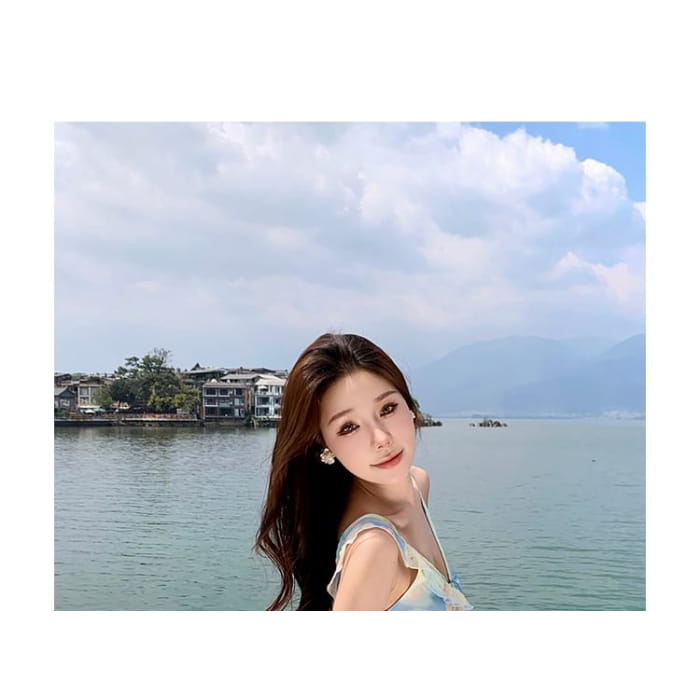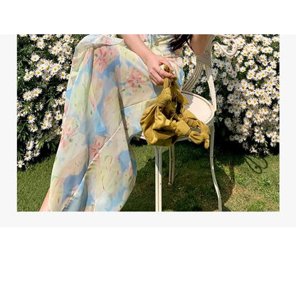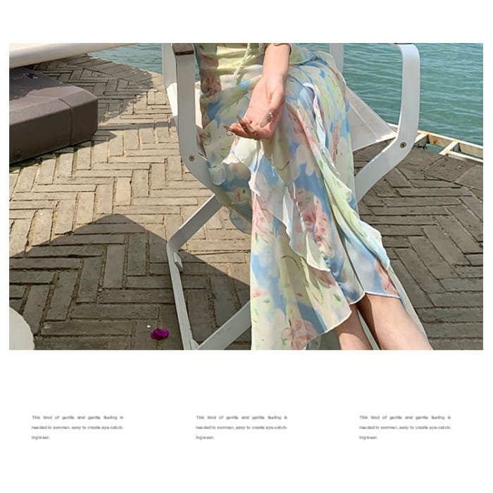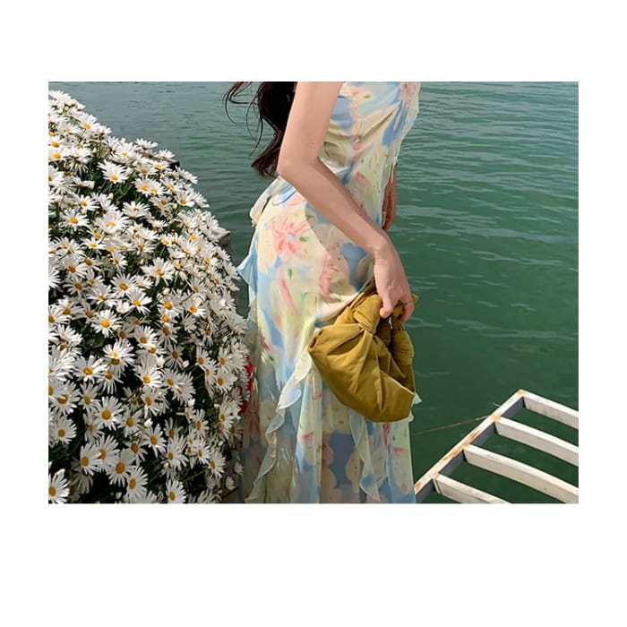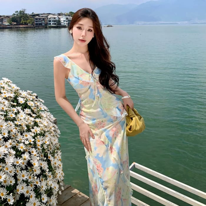 Spaghetti Strap Floral Ruffle Trim Maxi Sheath Dress