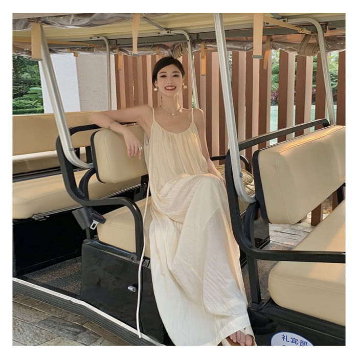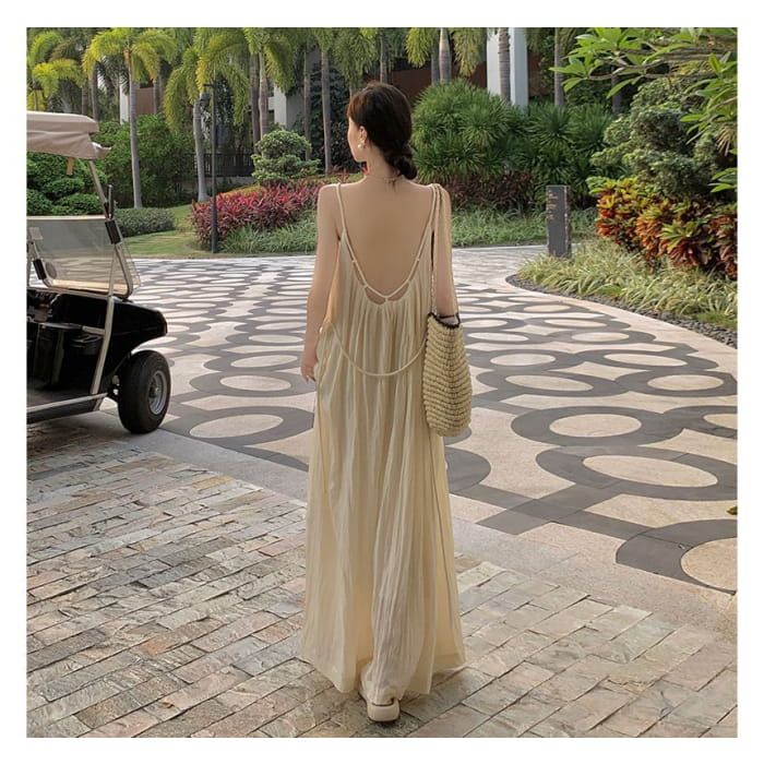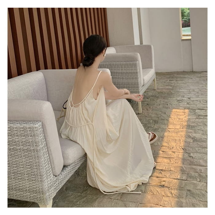 Spaghetti Strap Plain Open Back Shirred Midi Sundress