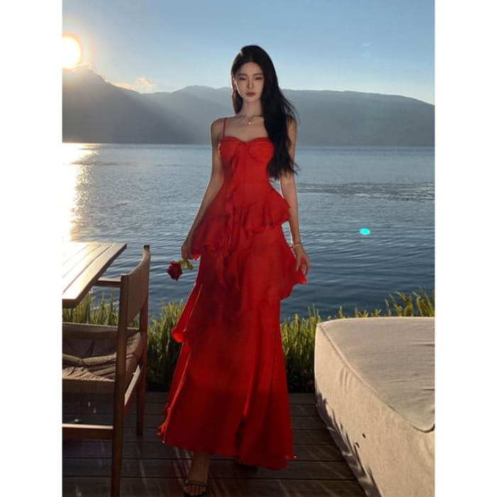Spaghetti Strap Plain Ruffle Tiered Slit Maxi A-Line Dress