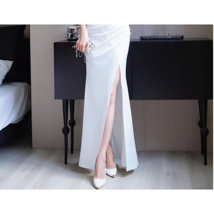 Spaghetti Strap V-Neck Plain Slit Mermaid Evening Gown