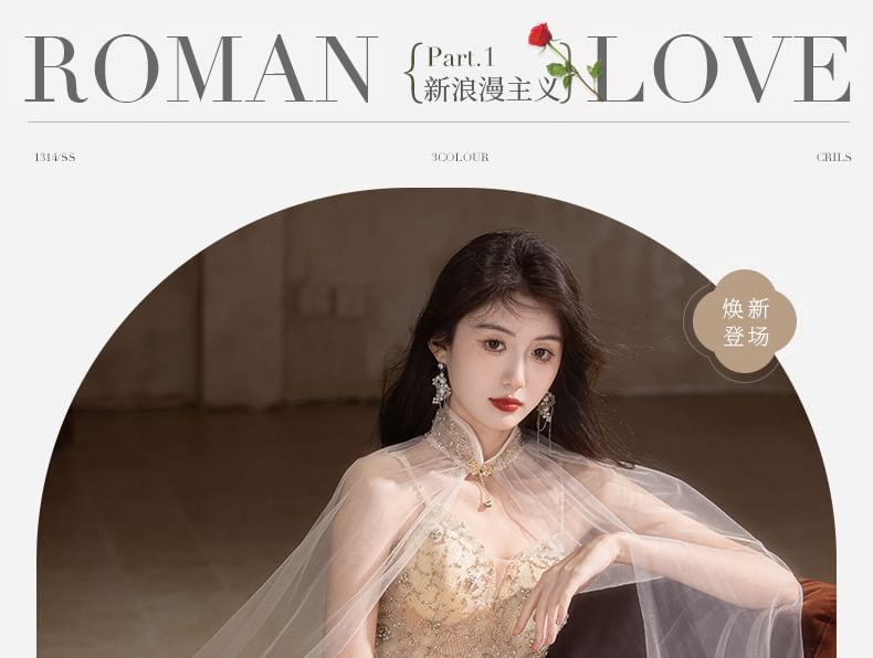 Spaghetti Strap V-Neck Floral A-Line Evening Gown / Sheer Panel Cape