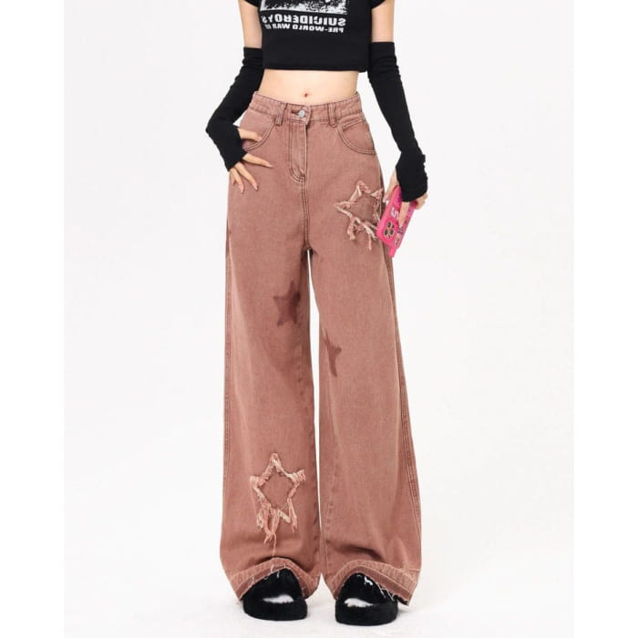 Enhance your wardrobe with these stylish star patch pink jeans. Perfect for adding a touch of elegance to any outfit, these jeans feature unique star patches for a subtle pop of color and flair. Made from high-quality materials, these jeans are both comfortable and chic. Elevate your fashion game with Star Patch Pink Jeans.