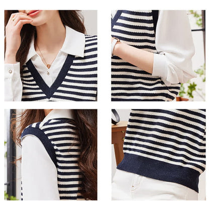 Stripe Fake Two Pieces Knit White Lapel Shirt