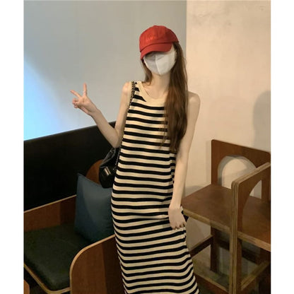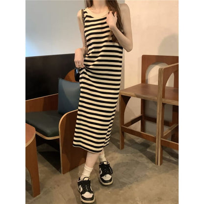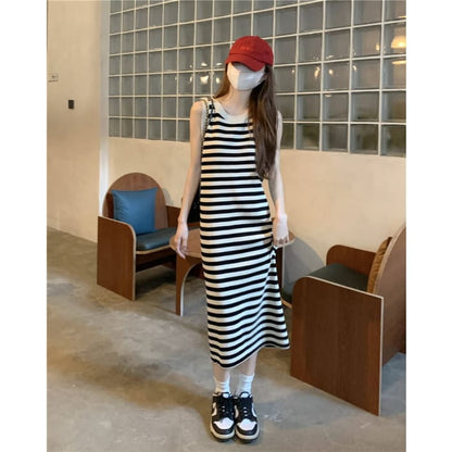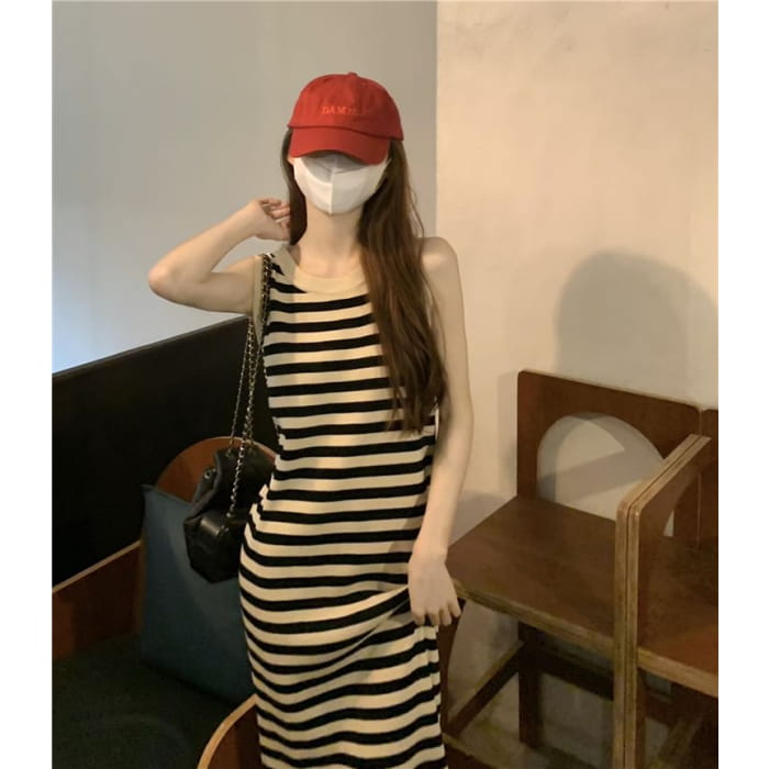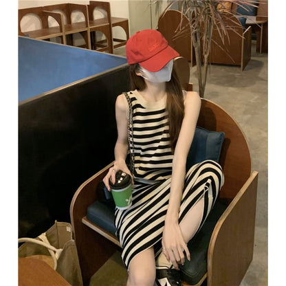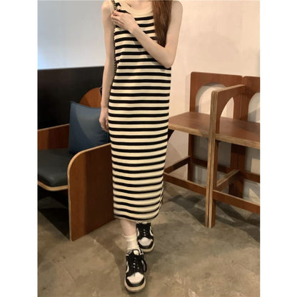 Striped Sleeveless Round Neck Bodycon Long Dress