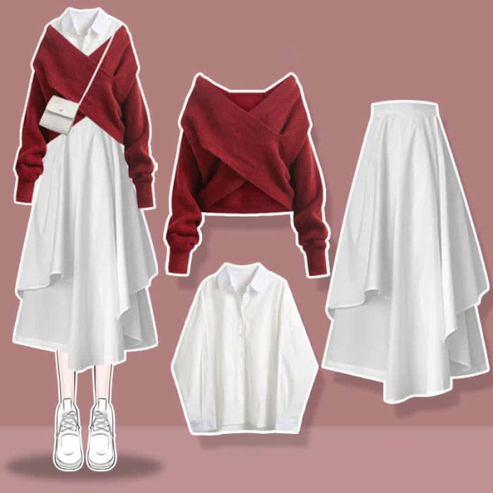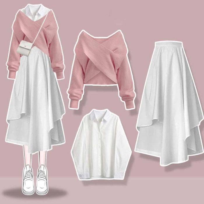Sweet Cross Knit Sweater Lapel Shirt Irregular Skirt Set
