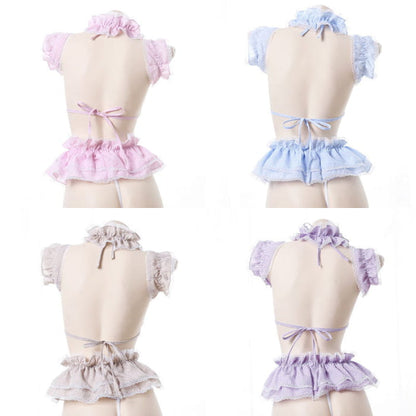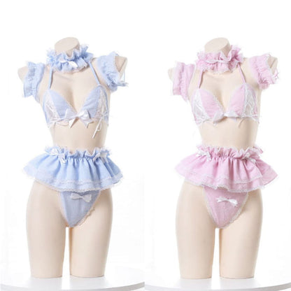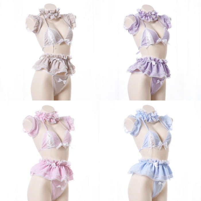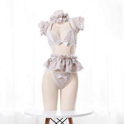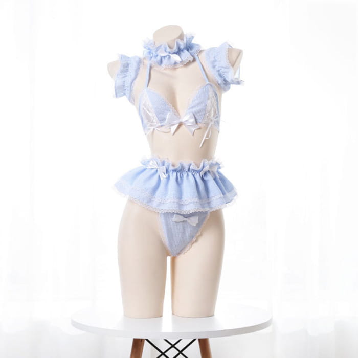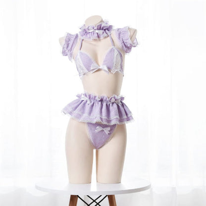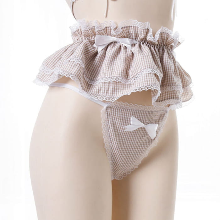 Sweet Lace Bow Knot Plaid Maid Bikini Lingerie Set