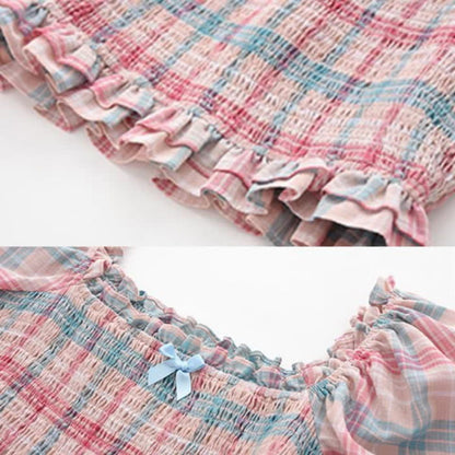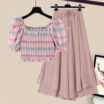 Sweet Pink Plaid Puff Sleeve Top T-Shirt Split Wide-leg Pants