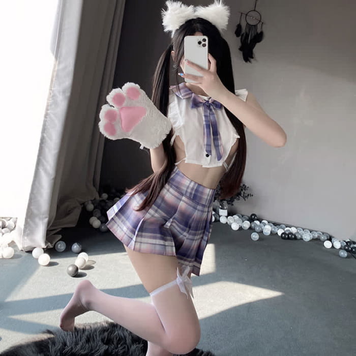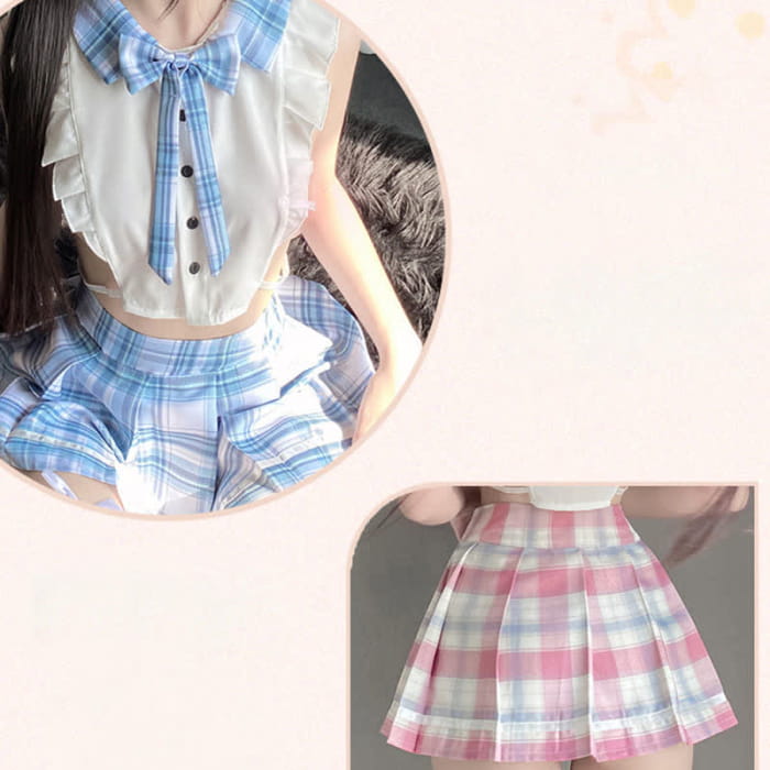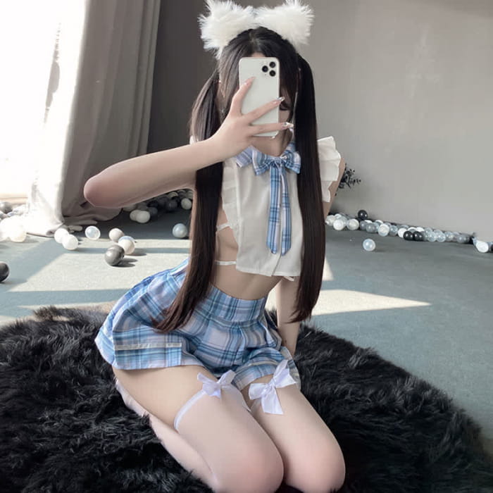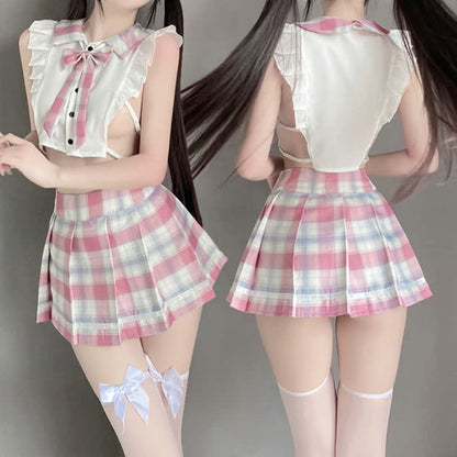 Sweet Plaid Hollow Out Sexy Lingerie Stockings Set