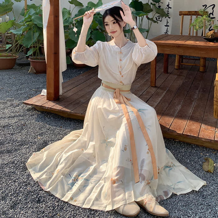 Sweet Puff Sleeve Shirt Floral Print Pleated Midi Skirt
