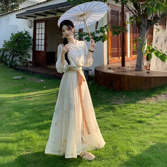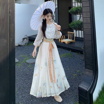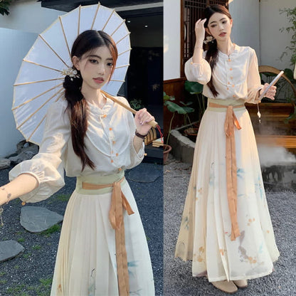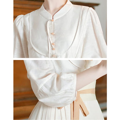 Enhance your feminine charm with the elegant Sweet Puff Sleeve Shirt and Floral Print Pleated Midi Skirt. Beautifully designed with delicate puff sleeves and a flattering pleated skirt, this set is perfect for any occasion. The sweet floral print adds a touch of whimsy to your outfit, making you stand out in style.