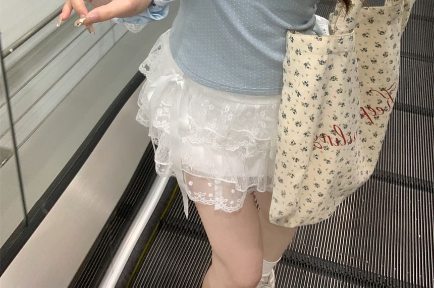 Short-Sleeve Scoop Neck Bear Print Lace Trim Slim Fit Crop Tee