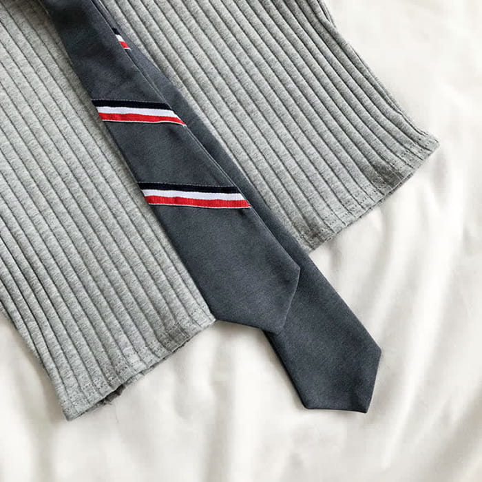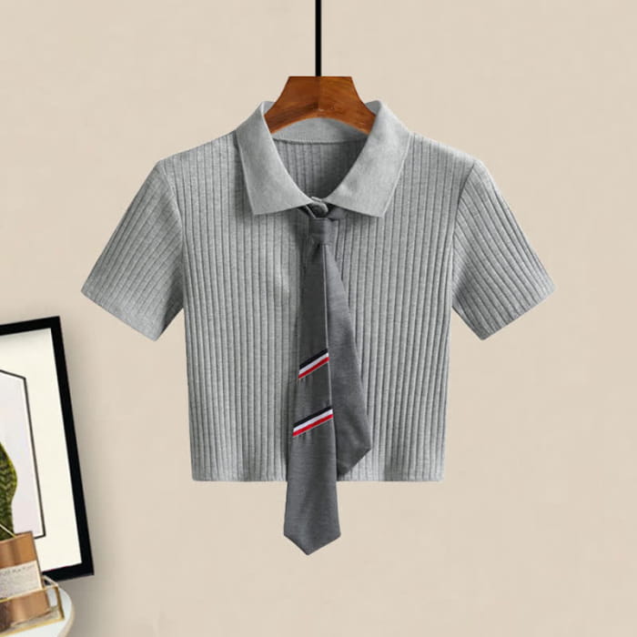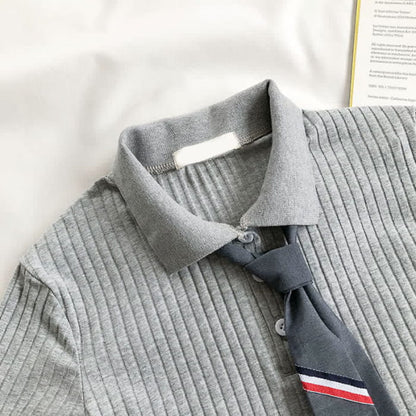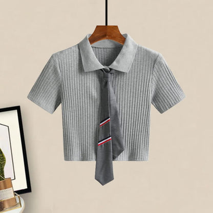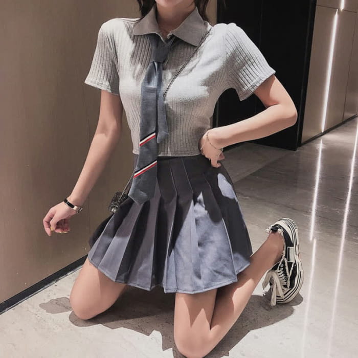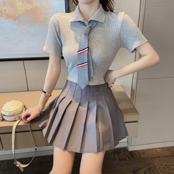 Tie Polo T-Shirt Crop Top Pleated Skirt Set