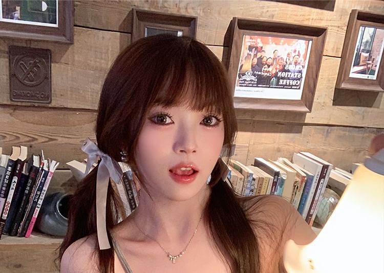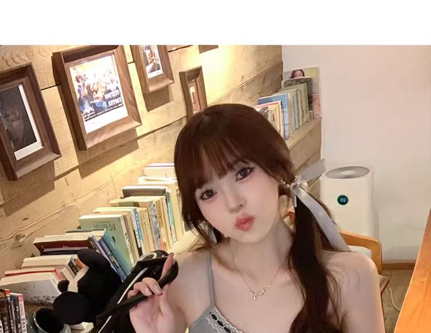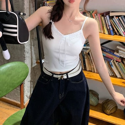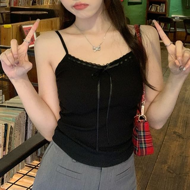 Top Bow Lace Plain Crop V-Neck Cami Trim Accent