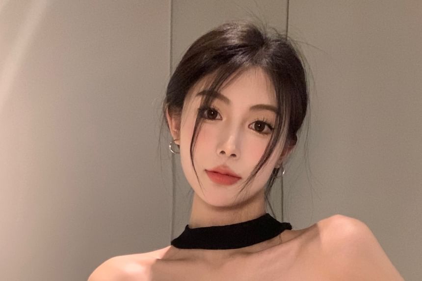 Short-Sleeve Halter Neck Off Shoulder Plain Slim Fit Crop Top