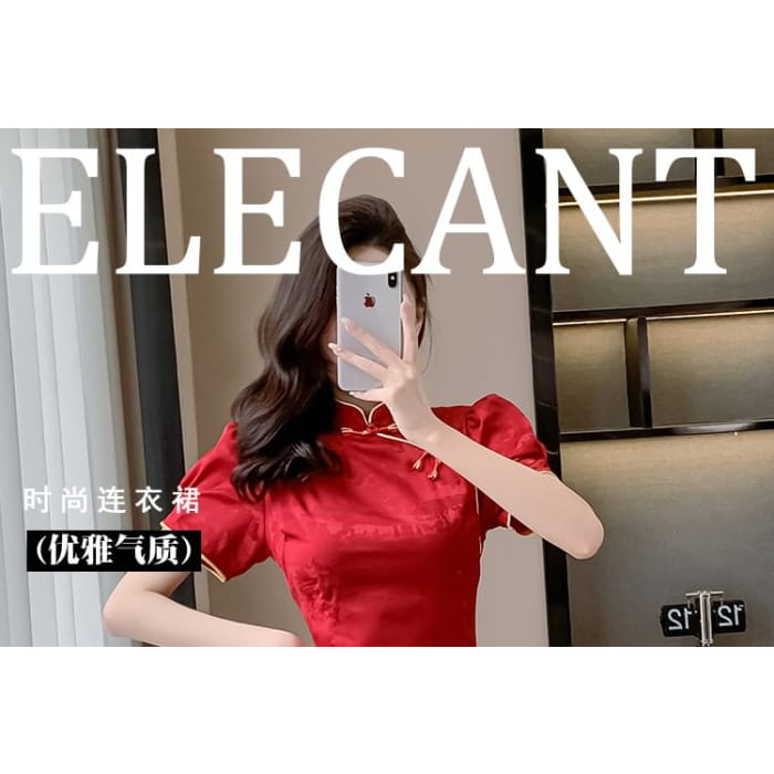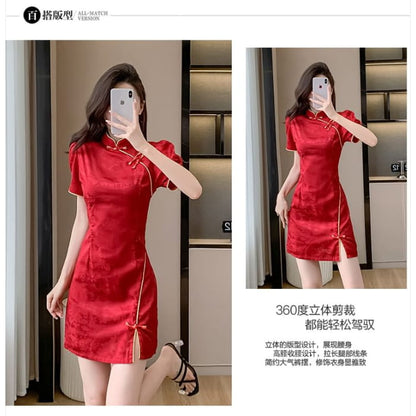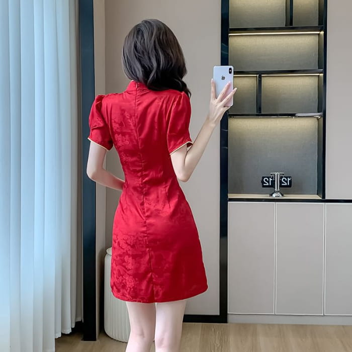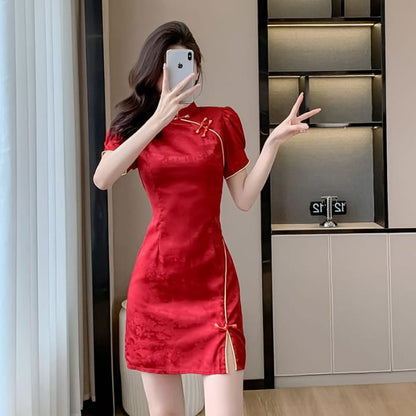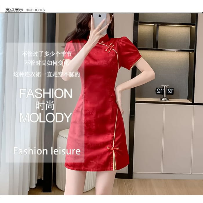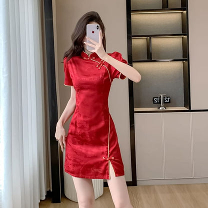 Traditional Chinese Short-Sleeve Stand Collar Jacquard Contrast Trim Frog Buttoned Slit Mini A-Line Dress