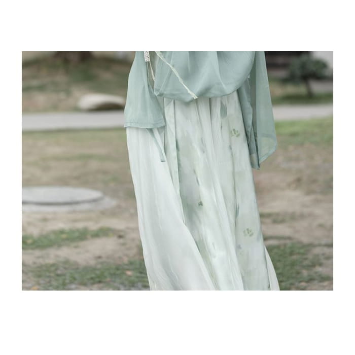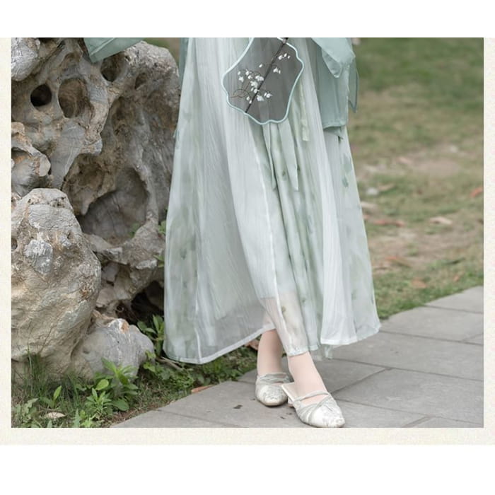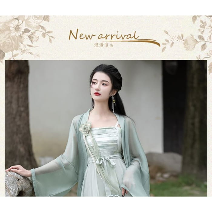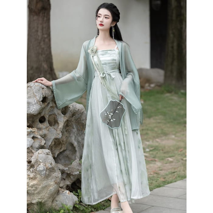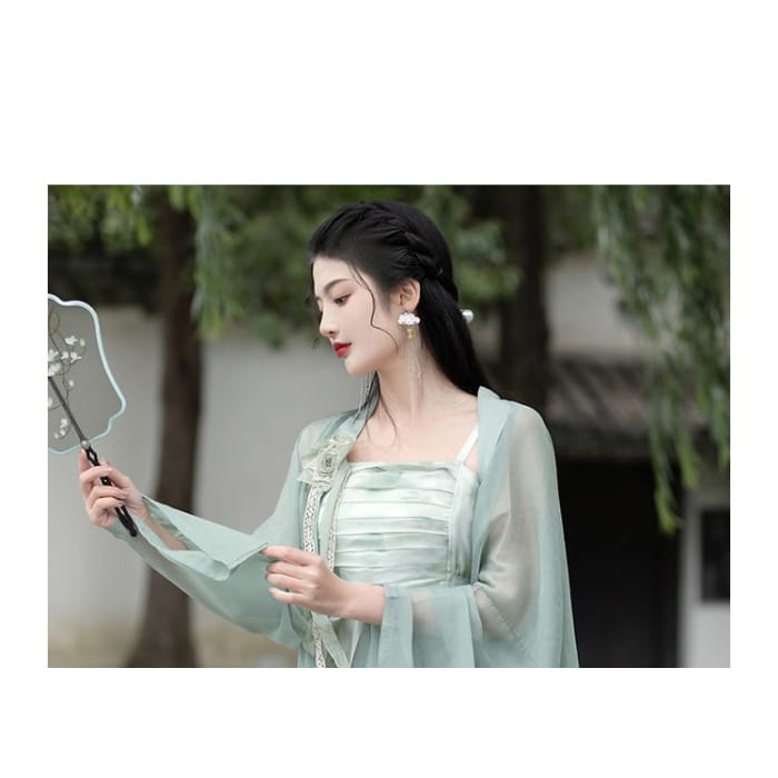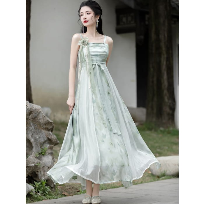 Traditional Chinese Spaghetti Strap Print Faux Pearl Midi A-Line Dress / Light Jacket / Flower Brooch