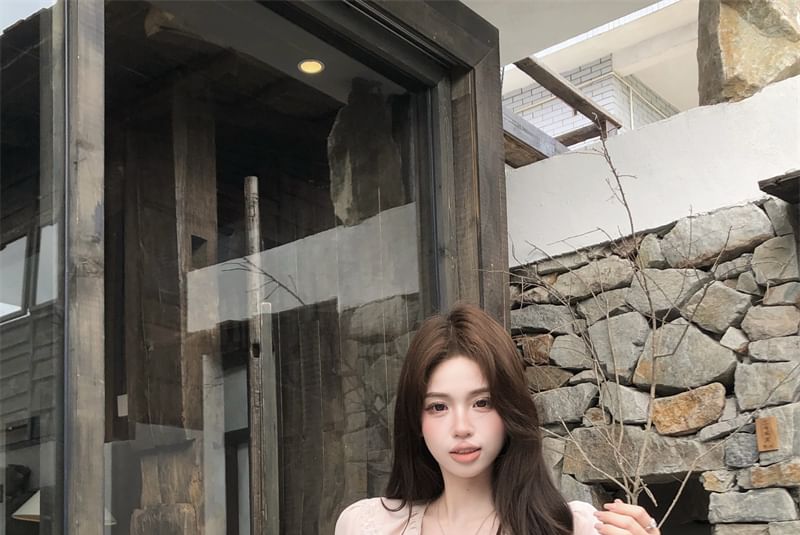Puff-Sleeve V-Neck Plain Lace Trim Ruffle Blouse