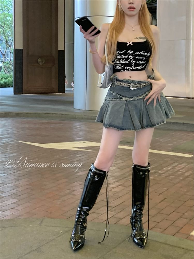 Trim Rise Mini Denim Washed A-Line Tassel Skirt Mid