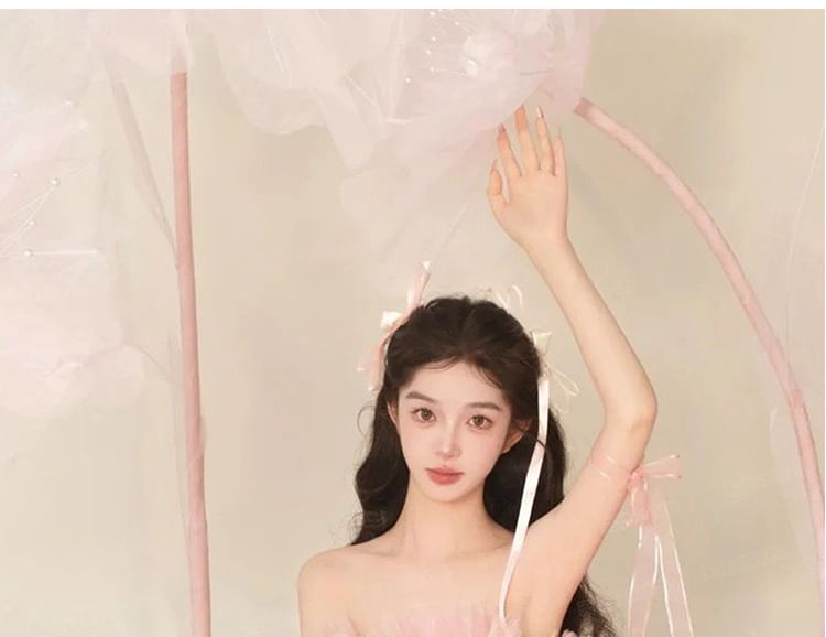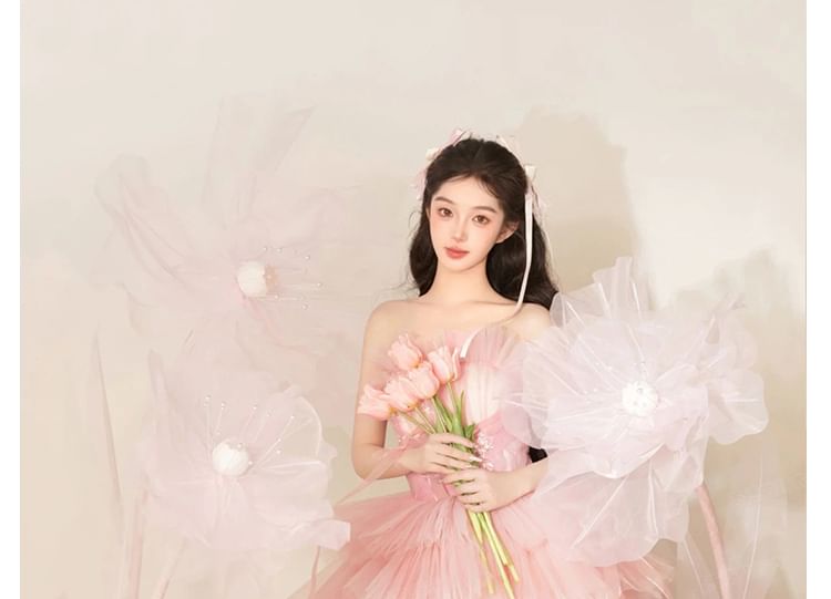 Plain Tiered Lace Panel Mesh A-Line Tube Evening Gown