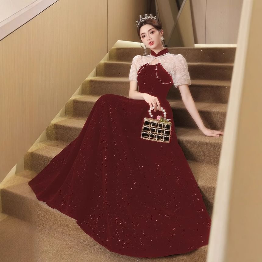 Two Glitter Gown Neck Tone Mock Embroidered Flower Evening Puff-Sleeve A-Line