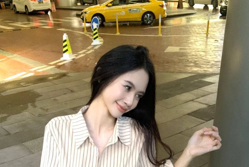 Up High Leopard Collared / Striped Skirt Long-Sleeve Waist Button Mini Pencil Shirt Print