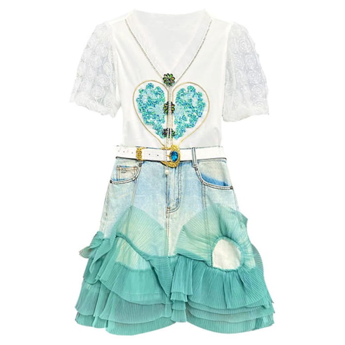 This elegant V-neck Heart Print Shirt Denim Skirt effortlessly combines classic denim with a playful heart print design. The V-neck adds a touch of sophistication while the denim skirt provides comfort and versatility. Perfect for a day out or a casual night on the town.
