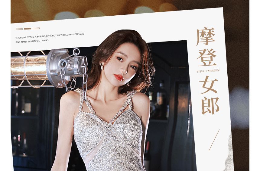 Spaghetti Strap V-Neck Plain Sequin Faux Pearl Beaded Mermaid Evening Gown