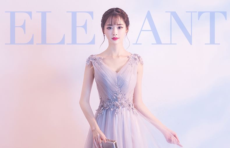 V-Neck Mesh / Evening Ruched Plain Floral Mini Applique Gown Cocktail Sleeveless A-Line Dress