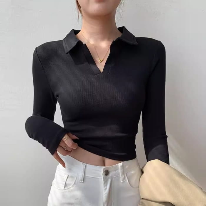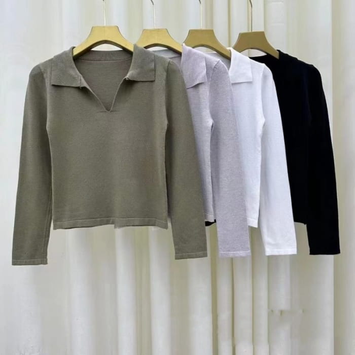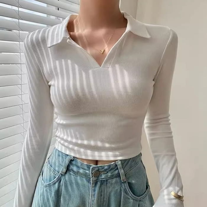V-Neck Plain Cropped Knit Top