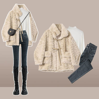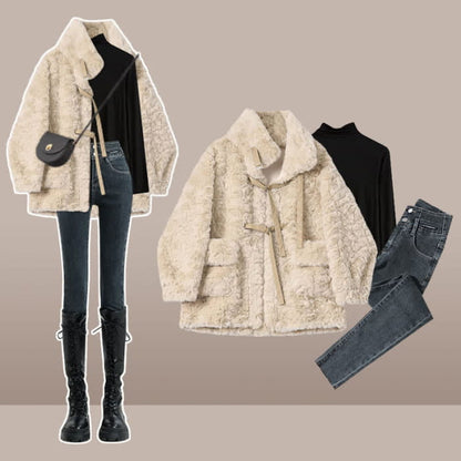 Velvet Buckle Coat Turtleneck Top High Waist Slim Denim Pants