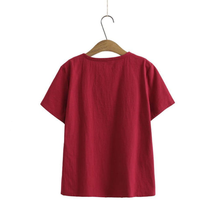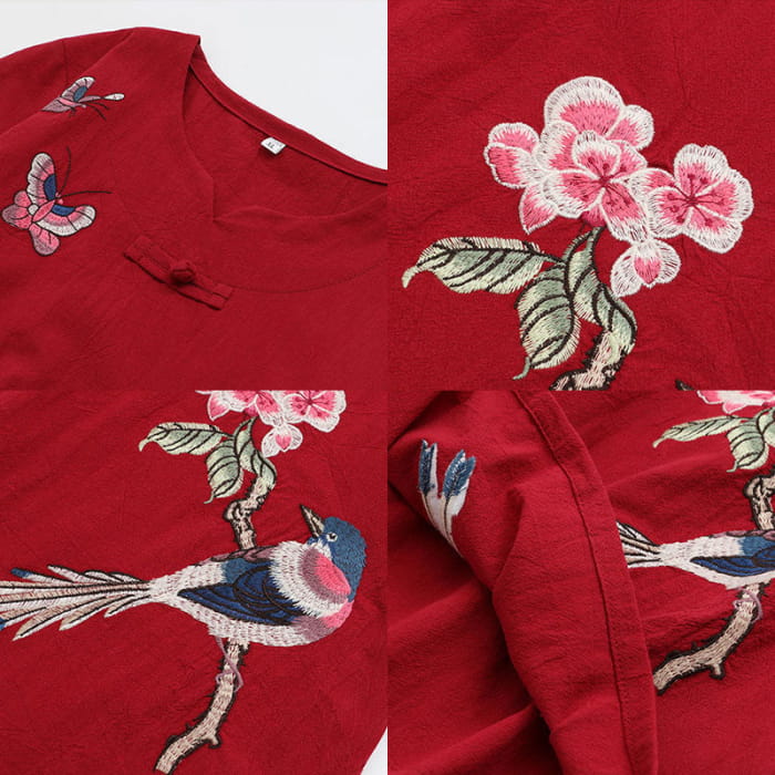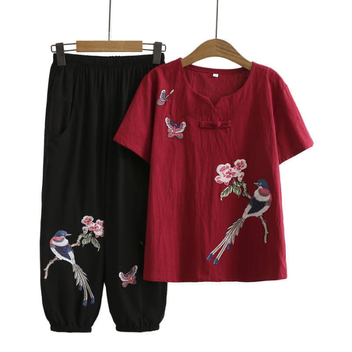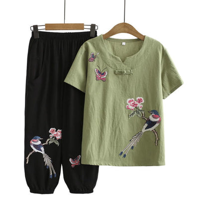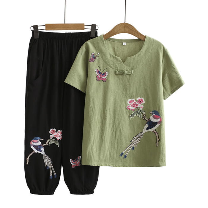 Vintage Bird Embroidery Buckle T-Shirt Pants Set