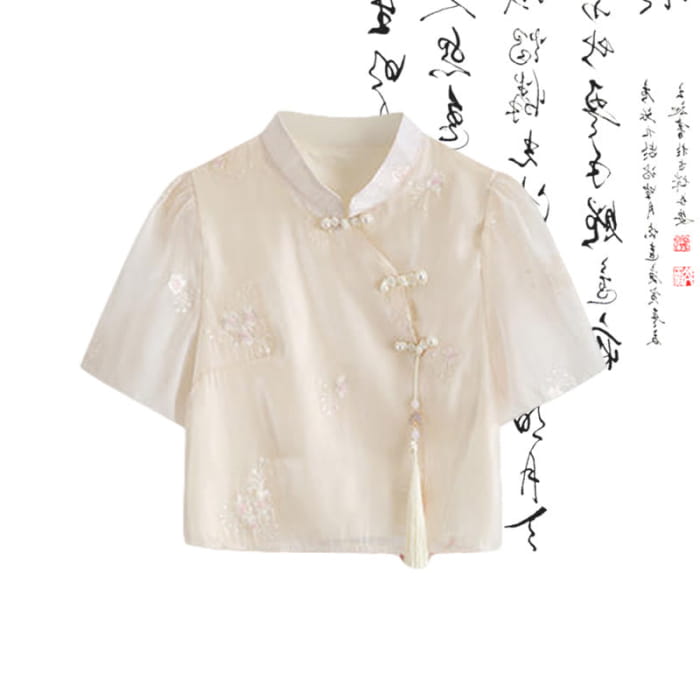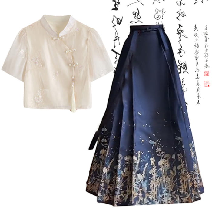 Vintage Buckle Tassel Shirt Blue Pleated Skirt