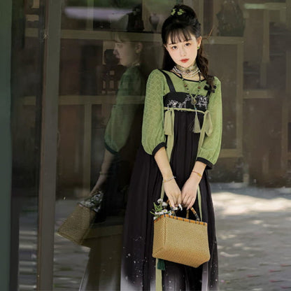Vintage Green Black Blossom Snow Print Slip Dress Shirt