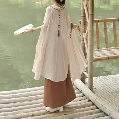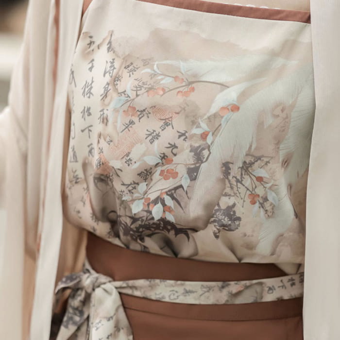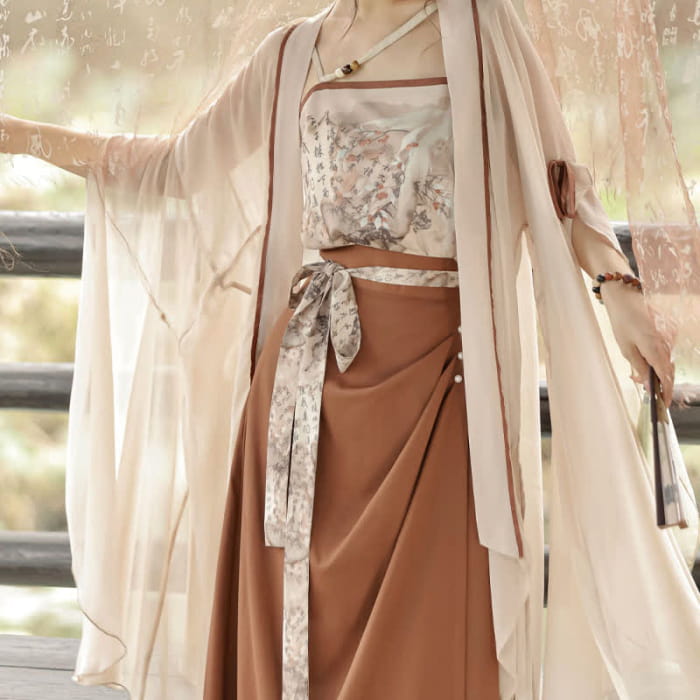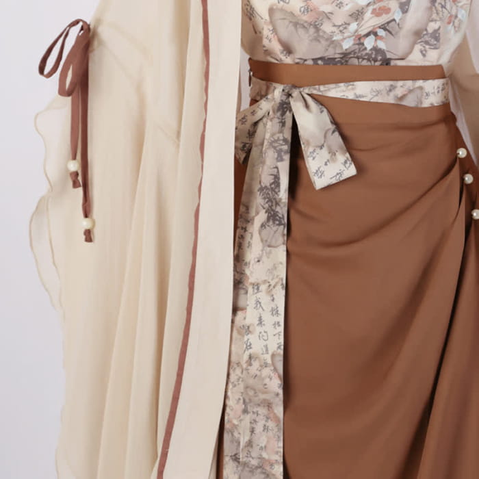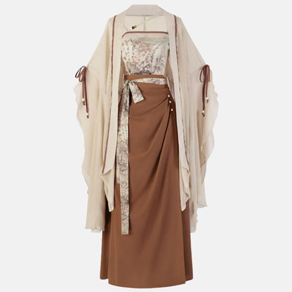 This elegant top cardigan and lace-up skirt feature a beautiful vintage painting print. Stand out with this unique and stylish ensemble, perfect for any occasion.