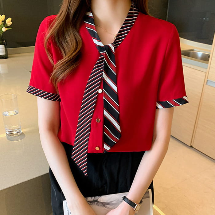 This elegant loose shirt features a vintage red stripe design with a tie detail, adding a touch of sophistication to your look. The loose fit allows for comfortable wear, while the unique design adds a stylish flair. Perfect for adding a touch of nostalgic charm to your wardrobe.