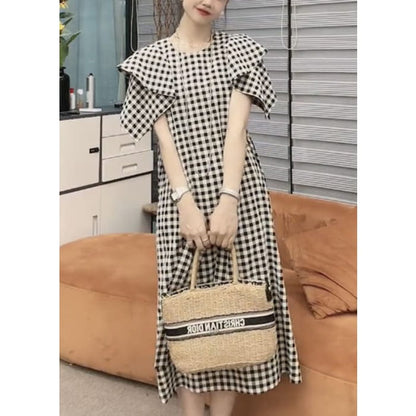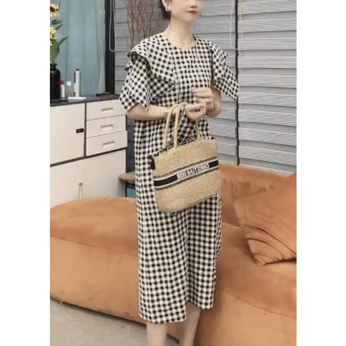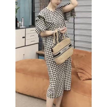 Vogue Black Plaid Tie Waist Long Dresses Short Sleeve VB1046