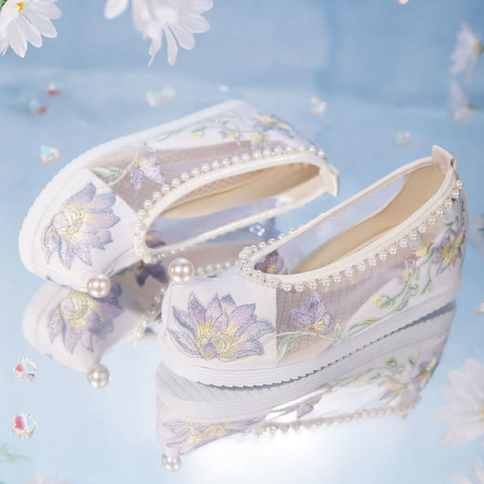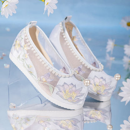 Indulge in elegance with our White Floral Embroidery Pearl Decor Mesh Shoes. Delicately crafted with intricate floral embroidery and adorned with pearls, these shoes exude sophistication and grace. The breathable mesh material ensures comfort while the design adds a touch of luxury to your ensemble. Elevate your style with every step.