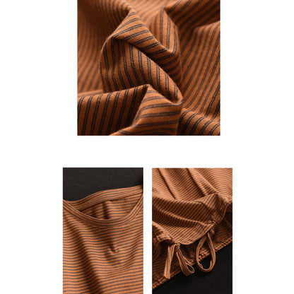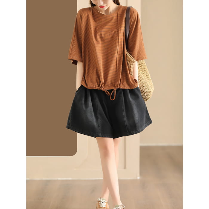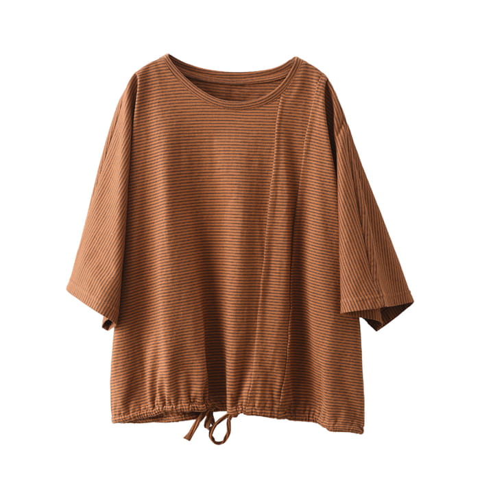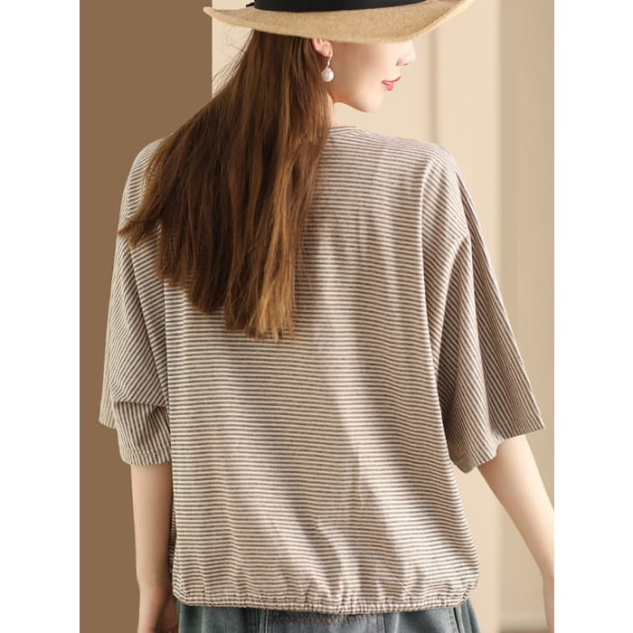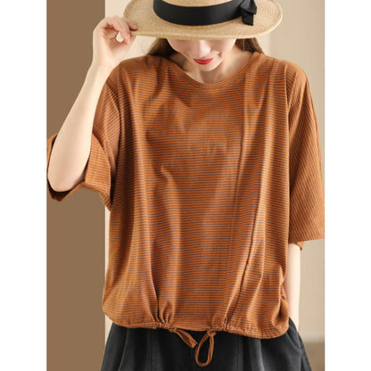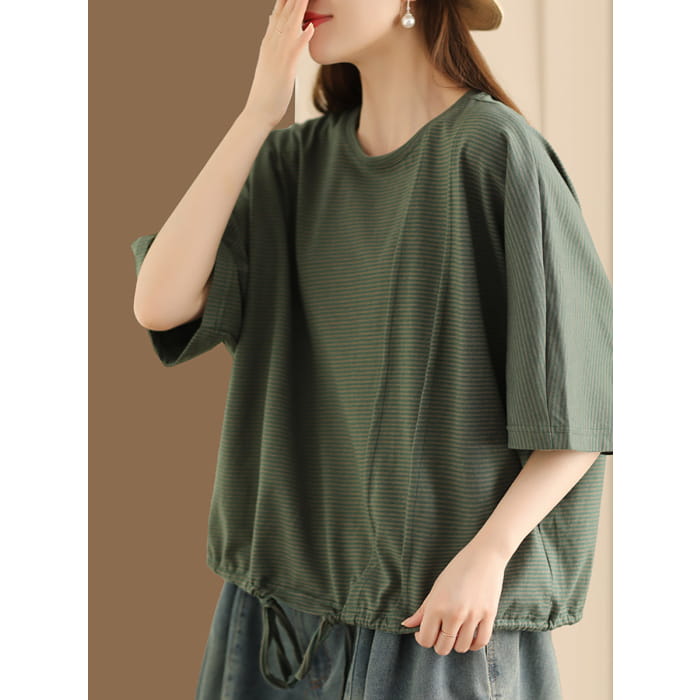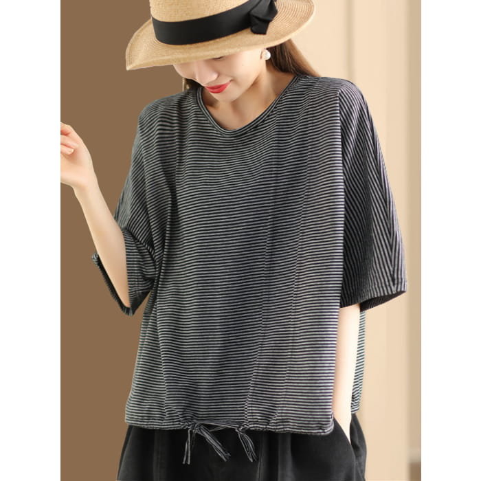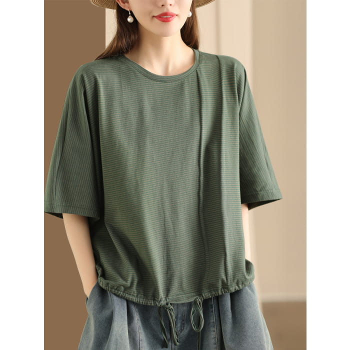 This women's summer cotton shirt (BN1043) features a loose fit, short sleeves, and stylish striped design. The drawstring adds a trendy touch. Stay comfortable and chic this season.
