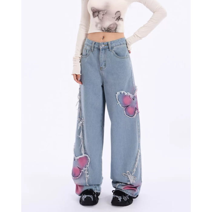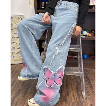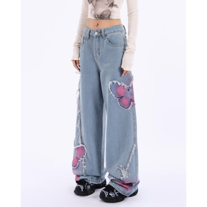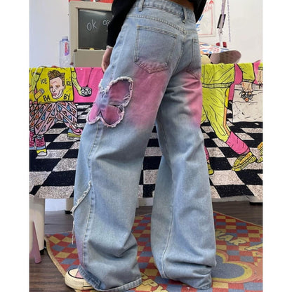 Elevate your style with our elegant Y2K Pink Butterfly Wide Leg Jeans. Made with high-quality material and designed with beautiful butterfly embellishments, these jeans will make you stand out from the crowd. Embrace the wide leg trend and add a touch of charm to your wardrobe.